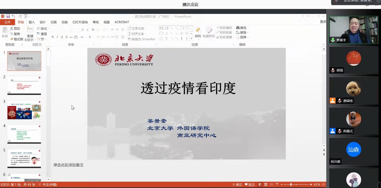2021年12月22日晚上19:00-21:00,由大学人事处、教师发展中心主办,日语公司、永利集团3044am(筹)承办的“著名教授论坛”第536讲在线进行。北京大学南亚研究中心主任姜景奎教授为公司师生开设了一场题为“透过疫情看印度”的讲座。讲座由公司副经理胡瑞副教授主持,南亚语言文学系全体师生和部分其它院系师生共140余人聆听了该讲座。