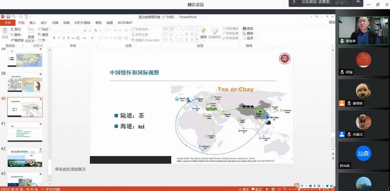 姜教授首先结合具体数据和图片向师生们介绍了印度疫情现状,进而深入分析了其背后的社会历史及文化背景,结合时政解读了印度政府、社会及民众对于疫情的反应,强调印度民族在疫情中的种种反应均与其宗教、社会文化背景息息相关,中国学者、媒体应以正确的态度看待印度社会及文化。姜教授指出,中印文化相互影响,也相互滋养,双边关系与文化交流正如“泥和水”的关系密不可分,而中印两国的友好发展也应建立在理解和接纳对方文化的基础之上,我们应正确理解“构建人类命运共同体”的意义,怀揣中国情怀和国际视野。