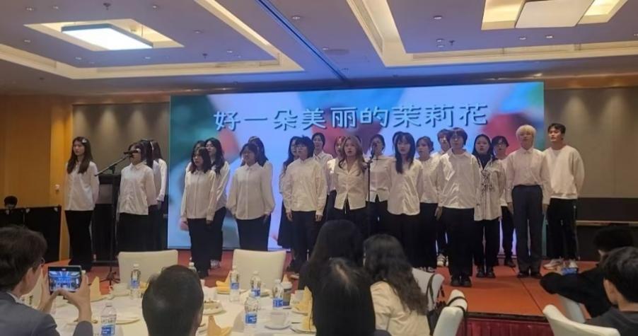 在晚宴上,广外朝鲜语系的同学们带来了精彩的歌唱与朗诵表演。表演中,员工们用中韩双语演唱了中韩民众耳熟能详的民歌,朗诵环节中表达了朝鲜语系学子促进中韩友好交往的期待与决心。充满激情,满载诚意的表演赢得了全场热烈的掌声。
