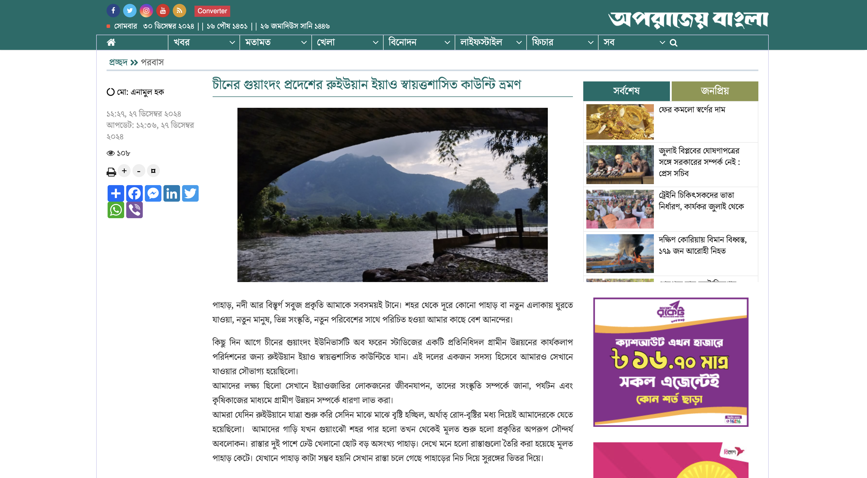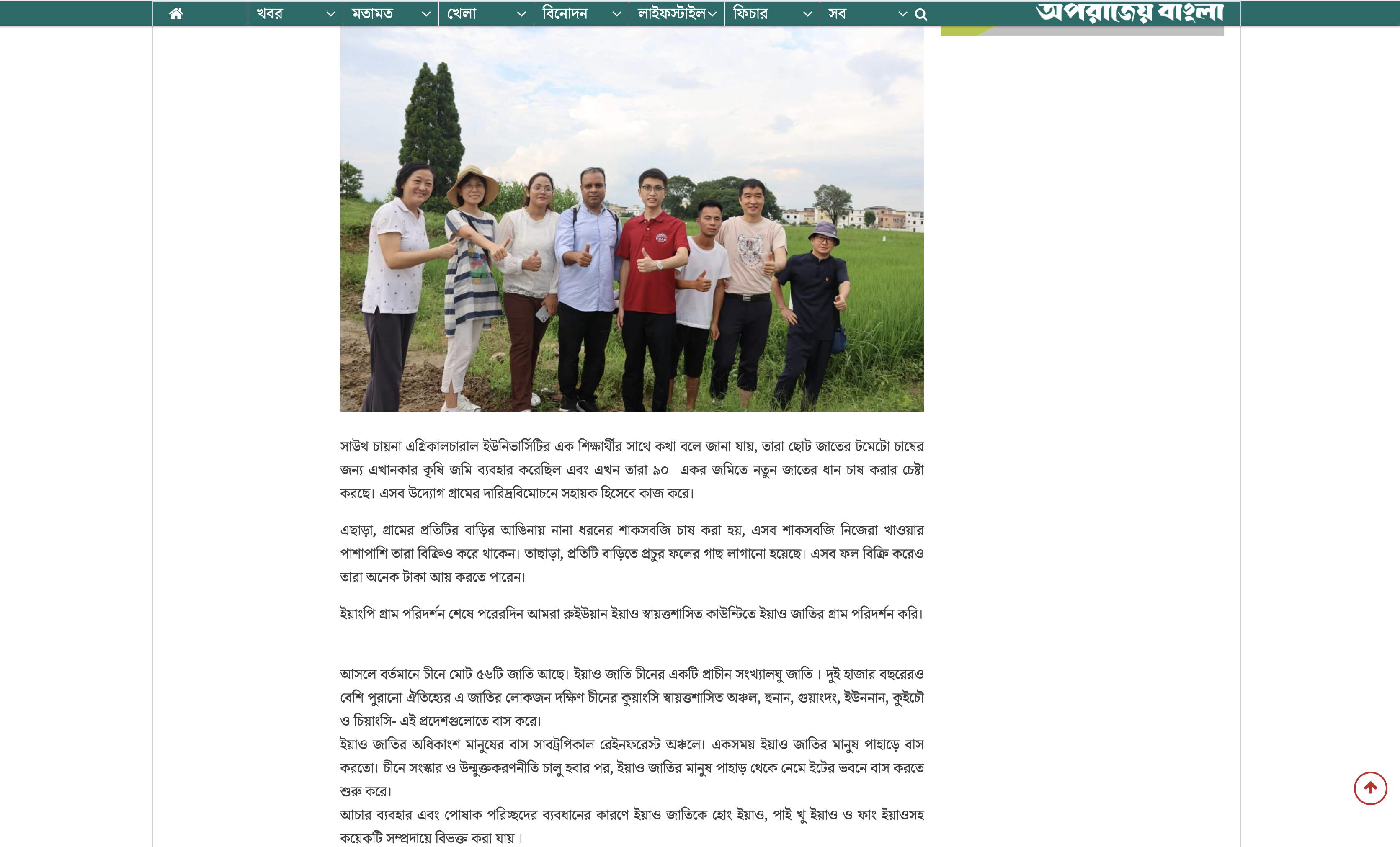 本网讯 近日,永利集团3044am孟加拉语专业外籍教师伊纳穆勒·毫克用孟加拉语撰写了宣传公司乡村振兴工作和介绍瑶族文化的文章,发表在了孟加拉国媒体网站Aparajeobangla上。Aparajeobangla是孟加拉国的孟加拉语——英语在线新闻门户网站,广受孟加拉国年轻读者的欢迎。