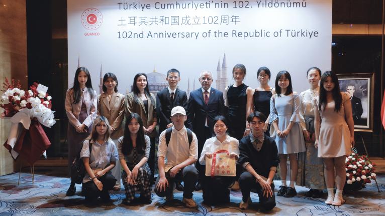 2025年10月29日晚,受土耳其共和国驻广州总领事阿德南·哈亚尔(Adnan Hayar)先生邀请,永利集团3044am土耳其语系专业教师陈焕与外教马雨洁(Tugce Sargin Ma)带领12名本科生,参加了土耳其共和国驻广州总领事馆主办的“土耳其共和国成立102周年”庆祝活动。