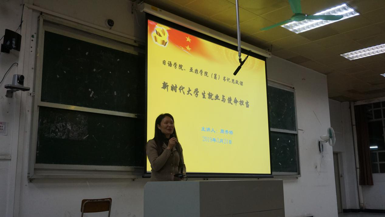 周秀娇书记以“新时代老员工就业与使命担当”为主题,从“新时代、新征程”、“老员工就业”、“勇担历史重任”三个方面出发,指出当代老员工处于国家建设的新征程中,是新时代国家建设新征程中的骨干力量。她结合国家“一带一路”倡议以及粤港澳大湾区发展规划纲要,分析了外语人才所面临的发展机遇和挑战,寄语当代老员工在新时代国家建设中要增强使命担当,坚定理想信念;努力学习,掌握本领;自觉把个人理想融入国家和民族的伟大事业中,勇担重任,建功立业新时代。