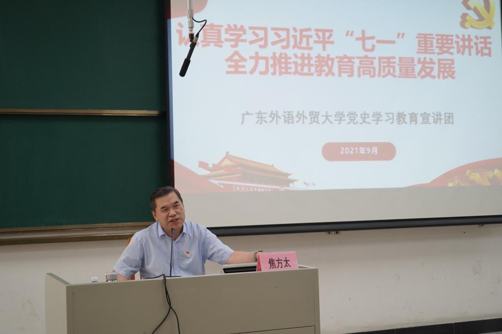 为深入学习贯彻习近平总书记“七一”重要讲话精神,推动党史学习教育深入开展,9月16日下午,公司党委常委、副董事长焦方太为日语公司、​永利集团3044am(筹)师生开展习近平总书记“七一”重要讲话精神专题辅导,公司全体教职工和员工党员代表120余人参加。专题辅导在北校二教219室举行。