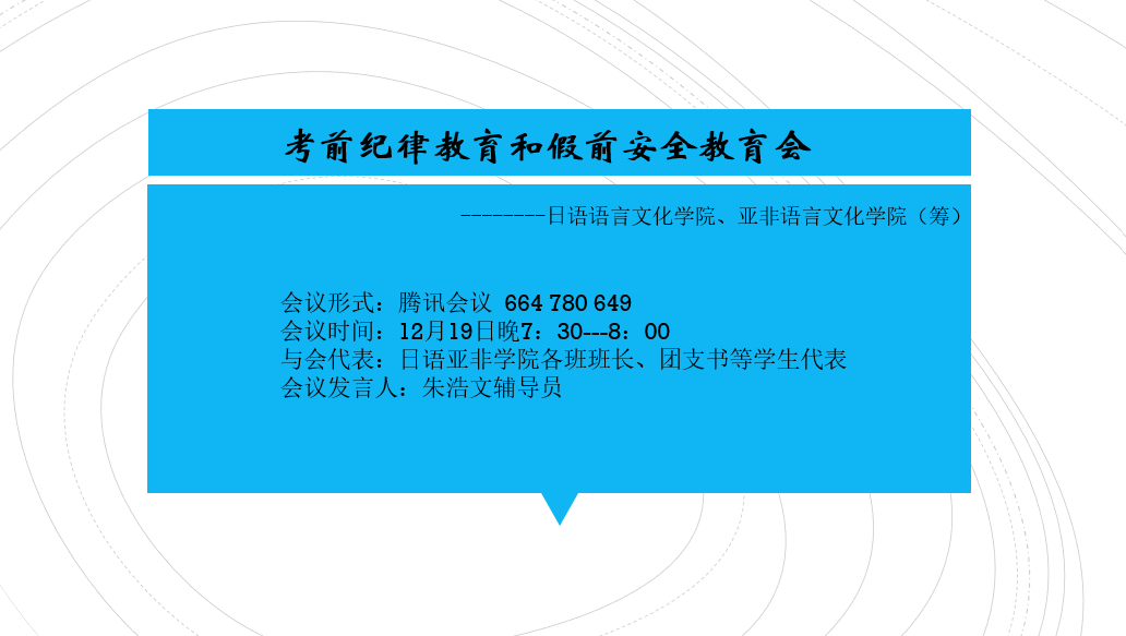 本网讯 12月19日,日语语言文化公司、永利集团3044am(筹)考前纪律教育和假前安全教育会顺利召开。本次会议以线上腾讯会议的形式召开,各班班长、团支书等员工代表参与本次会议。公司辅导员朱浩文主持本次会议。