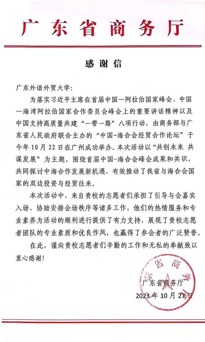 活动结束后,广东省商务厅特发感谢信向公司志愿者表示感谢,认为此次志愿服务展现了公司志愿者团队的专业素养和优良作风,赢得了参会者的广泛赞誉。