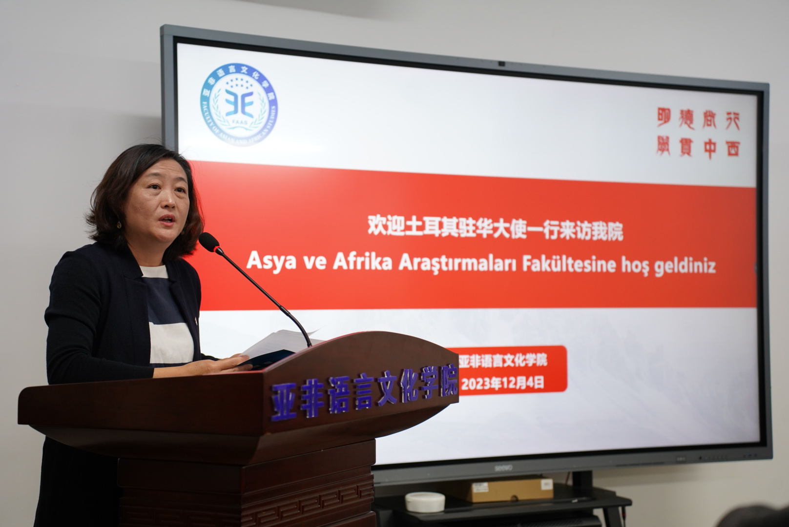 随后公司党委书记梁洁在致辞中热烈欢迎大使一行的到访,并对土耳其驻华使领馆之前给予公司土耳其语专业建设提供的支持表示感谢。同时提到广外永利集团3044am以培养全球化高素质公民为使命,着力推进“亚非语+英语+专业”的外语教学与专业教学深度融合,着力培养具有家国情怀、国际视野、过硬本领、创新能力、担当精神的、服务于国家“一带一路”的高素质复合型国际化亚非语人才,热切期望未来两国的青年和高校的学者能有更深入更密切的交往,共同推进文明交流互鉴,共同推进两国经济文化事业的发展。随后,土耳其语专业负责人黄嘉玲老师为大使一行介绍了土耳其语系的建设历史、培养方案和员工情况。