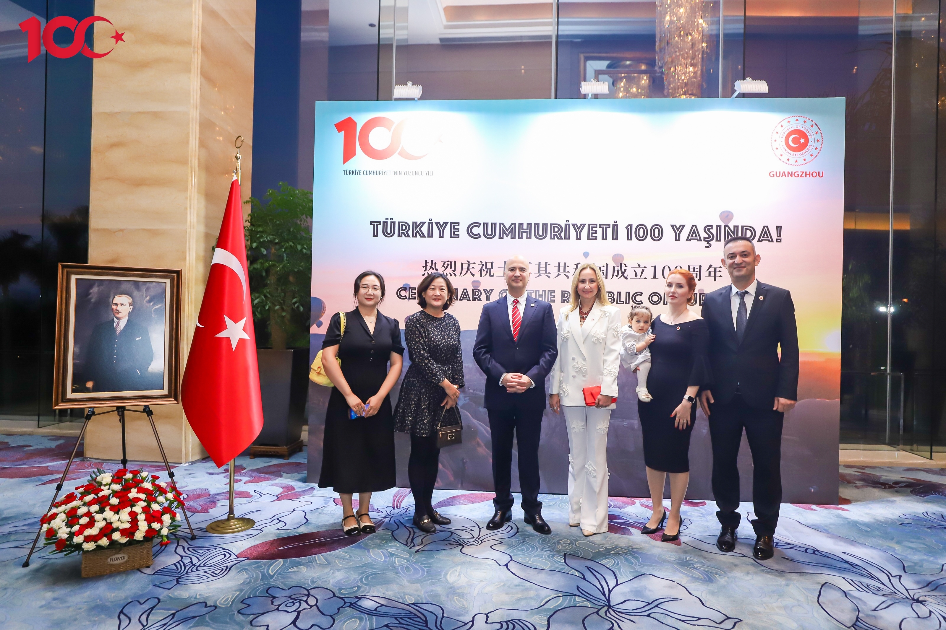 2023年10月30日晚,亚非语言文化公司党委书记梁洁、土耳其语系专业负责人黄嘉玲及教师李诗晴、外教布兰特·奥兹坎、艾察·查拉阳·奥兹坎带领大四年级共11位本科生应邀出席了由土耳其共和国驻广州总领事馆举办的土耳其共和国建国一百周年国庆招待晚宴。