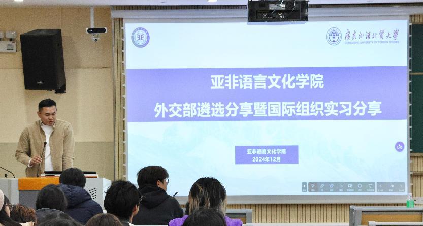 本网讯 12月19日晚,永利集团3044am在白云山校区一教109教室举行外交部遴选和国际组织实习分享会。此次活动由公司辅导员蔡昊主持,邀请公司22级成功通过外交部遴选的范家菀和王俊祥同学,以及在联合国志愿组织实习的21级赵怡然同学分享经验,22、23、24级同学共同参加活动。