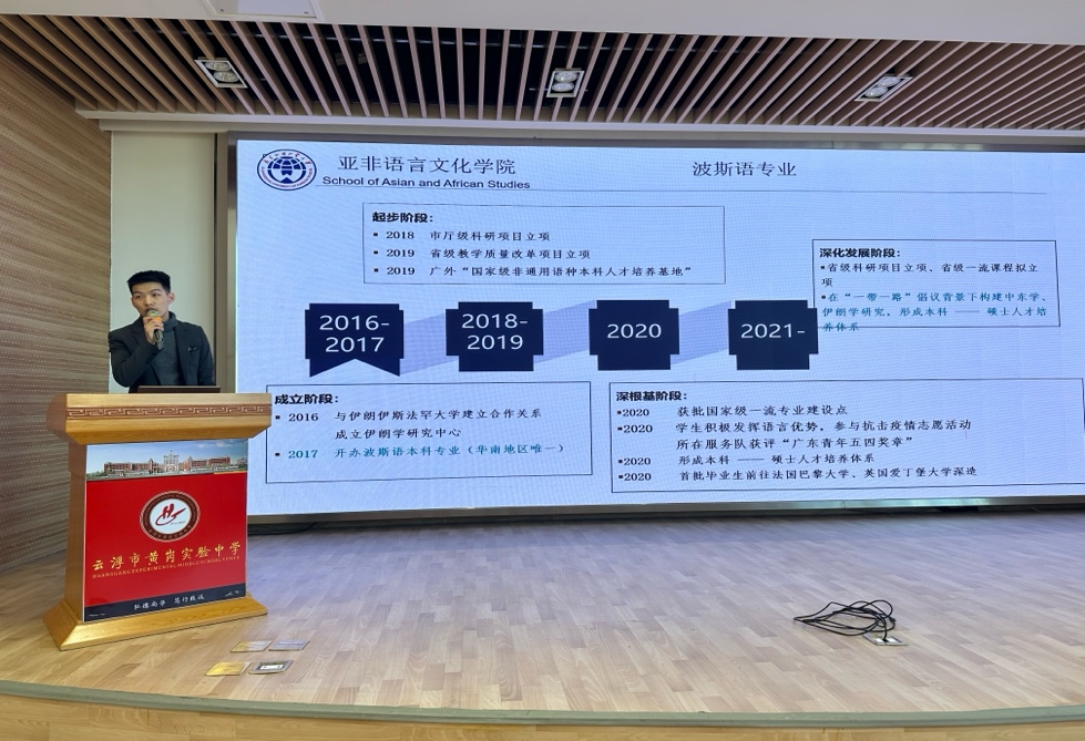 最后,波斯语专业教师代表邵晗雯从波斯语专业自成立以来取得的代表性育人成效、专业新开拓的实习基地建设等方面为同学们展开了生动而具体的讲述,并播放了本专业员工参与校园活动的精彩视频。至此,本次招生宣讲活动圆满结束。